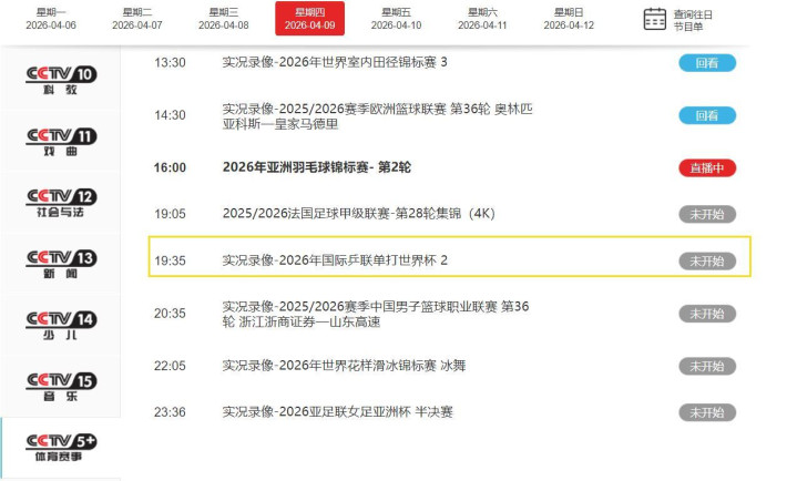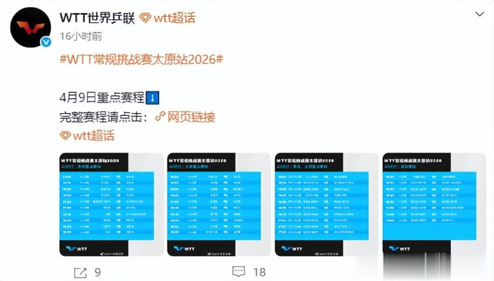 WTT世界乒联官方——4月9日重点赛程