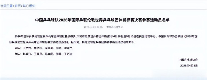 当中国乒协官网在4月8日晚间更新出那份伦敦世乒赛最终名单。