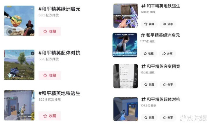像是在抖音,《和平精英》超体对抗、绿洲和地铁逃生等模式的单个话题标签视频都已经累积到几十、几百亿的播放量,其内容生态完全不亚于一款成功的热门产品。