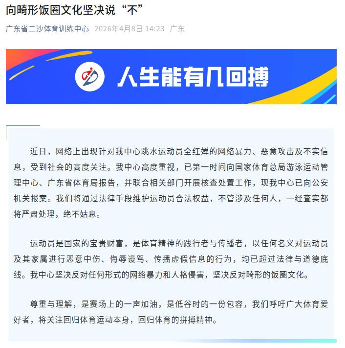 中青在线:《就全红婵等跳水运动员遭网暴事件 游泳中心发布官方声明》2026年4月8日