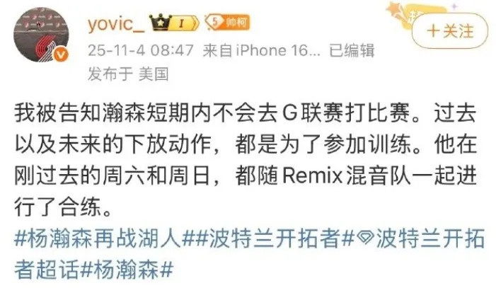 11月3日,@波兰特开拓者官宣:我们已经从发展联盟混音队召回了中锋杨瀚森。