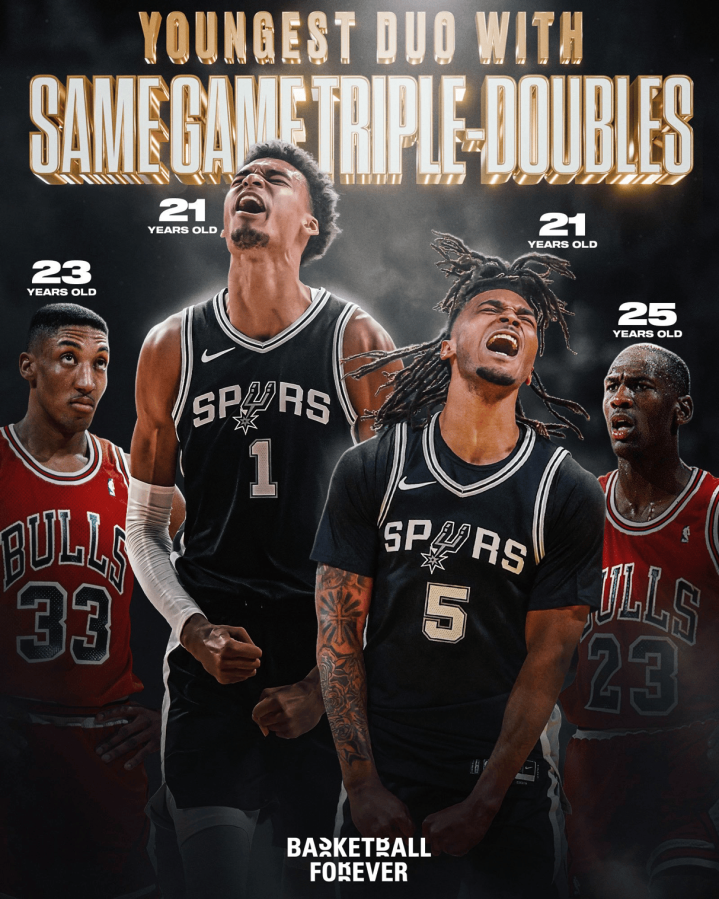 维克托-文班亚马和斯蒂芬-卡斯尔现在是NBA历史上最年轻的在同一场比赛中都获得三双的组合,超越了迈克尔-乔丹和斯科蒂-皮蓬。